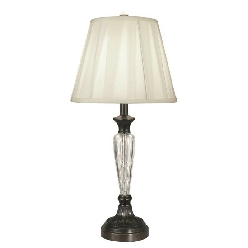 The beautiful facets in the tapered crystal column in this table lamp will shower any room with glittering sparkles. Standing a full 27.5” high, this lamp has a commanding presence. Our designers have added a simple, white pleated fabric shade to create a balance to the design. The solid metal base is finished in gorgeous oil rubbed bronze to complement the crystal. Solid crystal and a solid metal base give this lamp the old-fashioned artisan look that you have come to expect at a price that will fit into any budget.