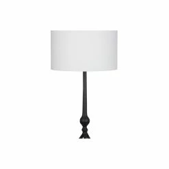 The Samantha Table Lamp has a metal industrial style black forged base and round finial with a fabric drum shade. The hand crafted details produced by a skilled artist lends itself to a unique technique and will vary slightly. Recommended for any room in the home.