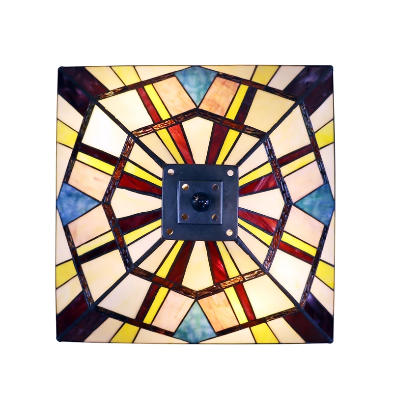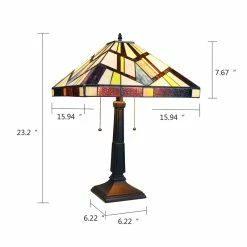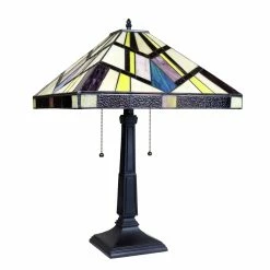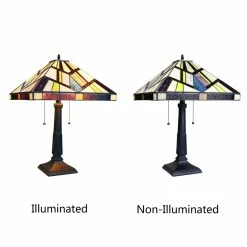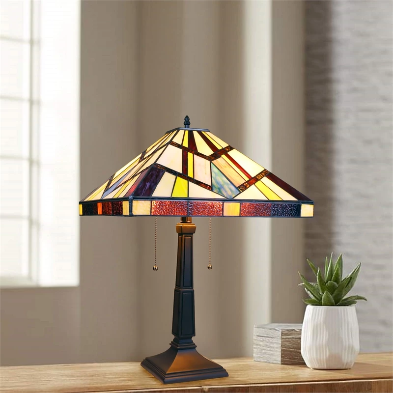 Vincent is a beautiful, stained glass table lamp in a traditional Mission style, featuring a blackish bronze base and 2 pull chains switches. This lamp would be perfect in a bedroom, living room, and dining room. The shade is hand-crafted, using the same methods developed by Louis Comfort in the early 1900’s. This process entails using 148 hand cut stained art glass pieces, each wrapped in fine copper foil and soldered together at extremely high temperatures to form each unique piece. Exact size to the nearest inch may vary, and exact color of each glass piece may vary due to each piece being hand crafted. First image is with the light shining through, second image is with no light. Dry listed and recommended for an indoor setting.