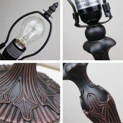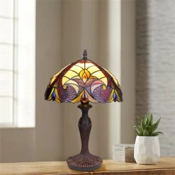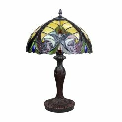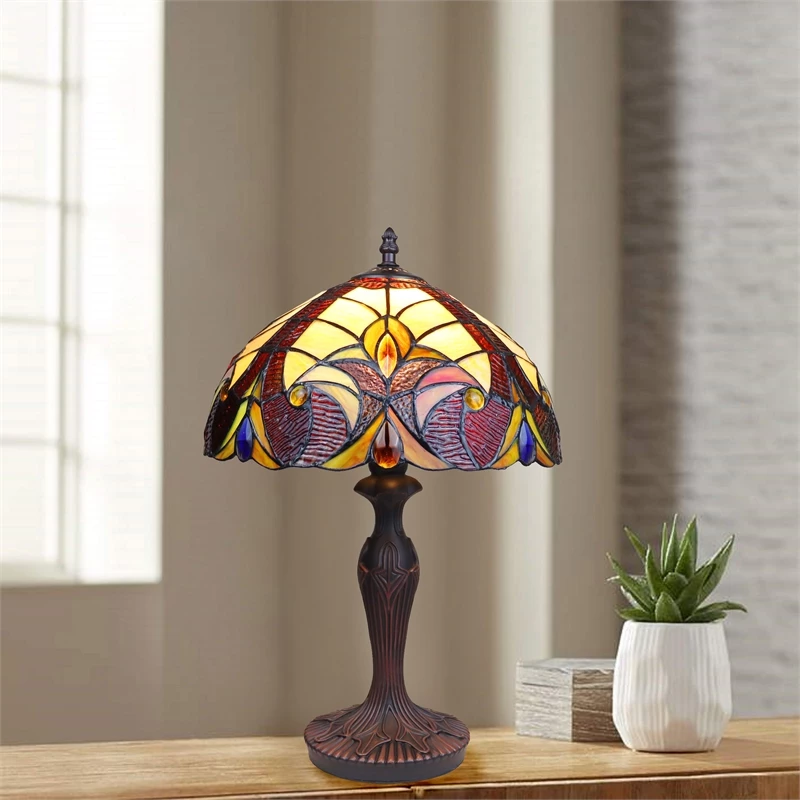 Adia is a beautiful, stained glass table lamp in a traditional Victorian style, featuring a dark bronze base and an on-cord rotary switch. This lamp would be perfect in a bedroom, living room, and dining room. The shade is hand-crafted, using the same methods developed by Louis Comfort in the early 1900’s. This process entails using 176 hand cut stained art glass pieces and 20 glass beads, each wrapped in fine copper foil and soldered together at extremely high temperatures to form each unique piece. Exact size to the nearest inch may vary, and exact color of each glass piece may vary due to each piece being hand crafted. First image is with the light shining through, second image is with no light. Dry listed and recommended for an indoor setting.
