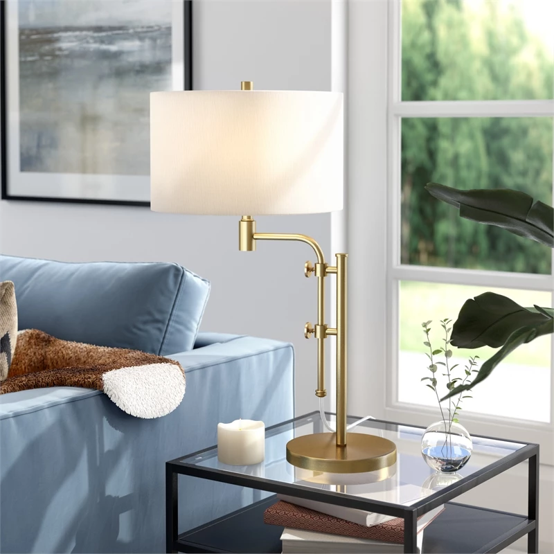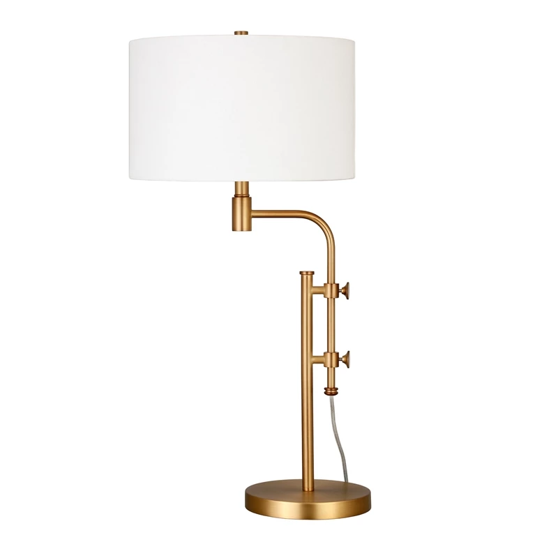 This industrial table lamp takes notes from factory lighting. It lightens the mood with a round, fabric shade, bringing in warm textures to both the lamp and the room around it. The adjustable height allows flexible options.