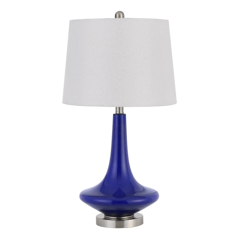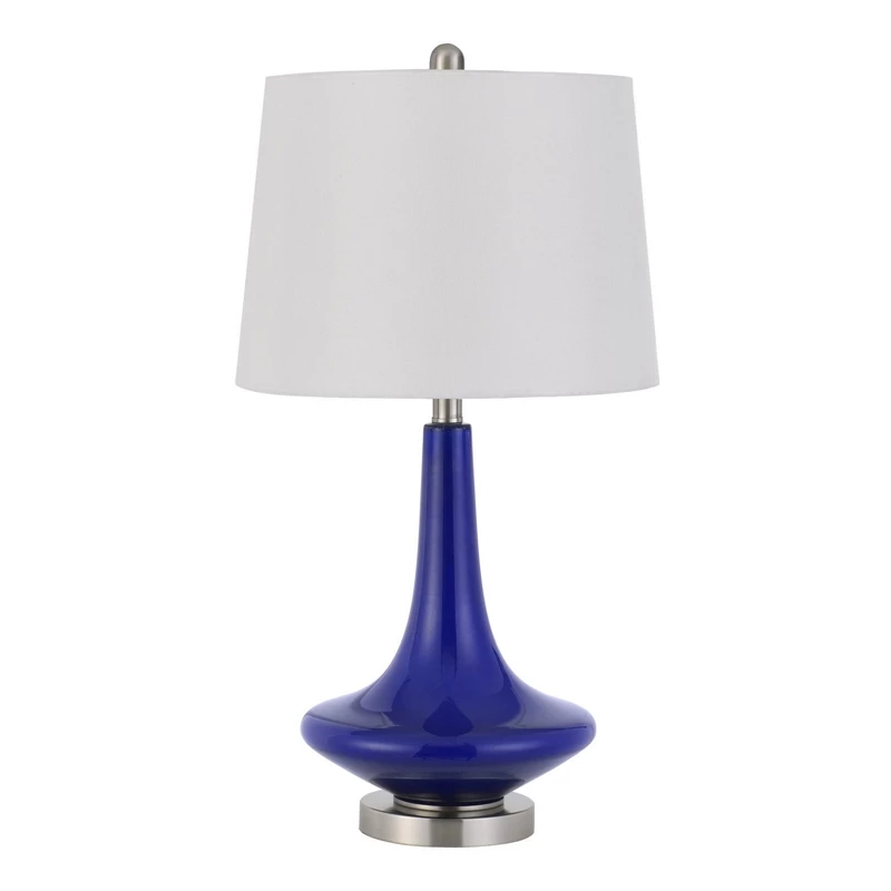 Transform your home with this Set of Two 26” Navy Blue Glass Table Lamps. This set features a wide navy blue glass bottom that tapers from the bottom up and sits on a slim silver steel base. The lampshade itself is white and has a tapered drum shape, which makes it perfect for your living room, dining room, or office space. 25.5” x 14” x 14”