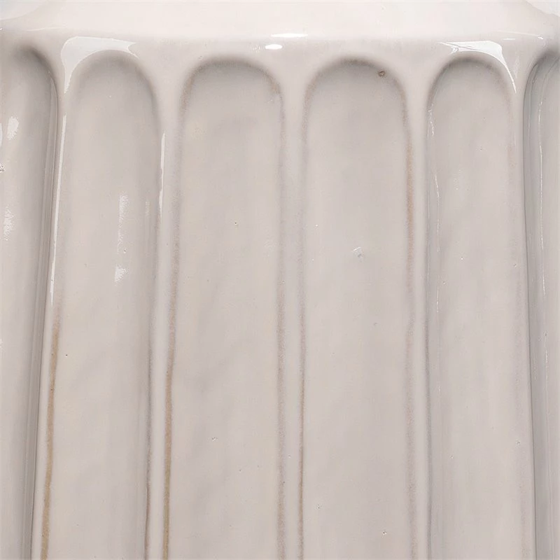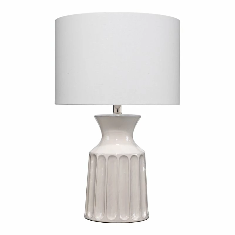 The Addison’s base is inspired by the effortless, casual elegance of European seaside villas. The ceramic base’s urn shape is enhanced with vertical ridged accents and a soft Off White glaze, and the neck and coordinating finial are silver. The look is topped off with a crisp white cotton drum shade to provide just a hint of gentle contrast.