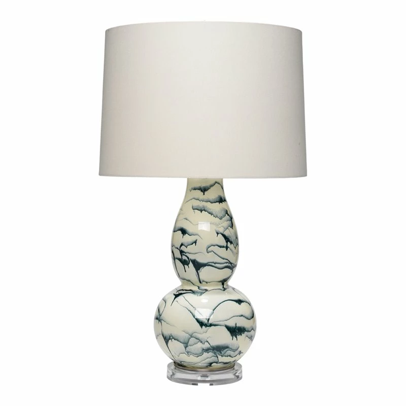 the Elodie double gourd table lamp has an artisan glaze in floating blue swirls on a creamy white body and silver base.