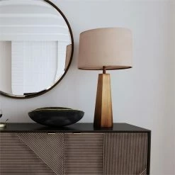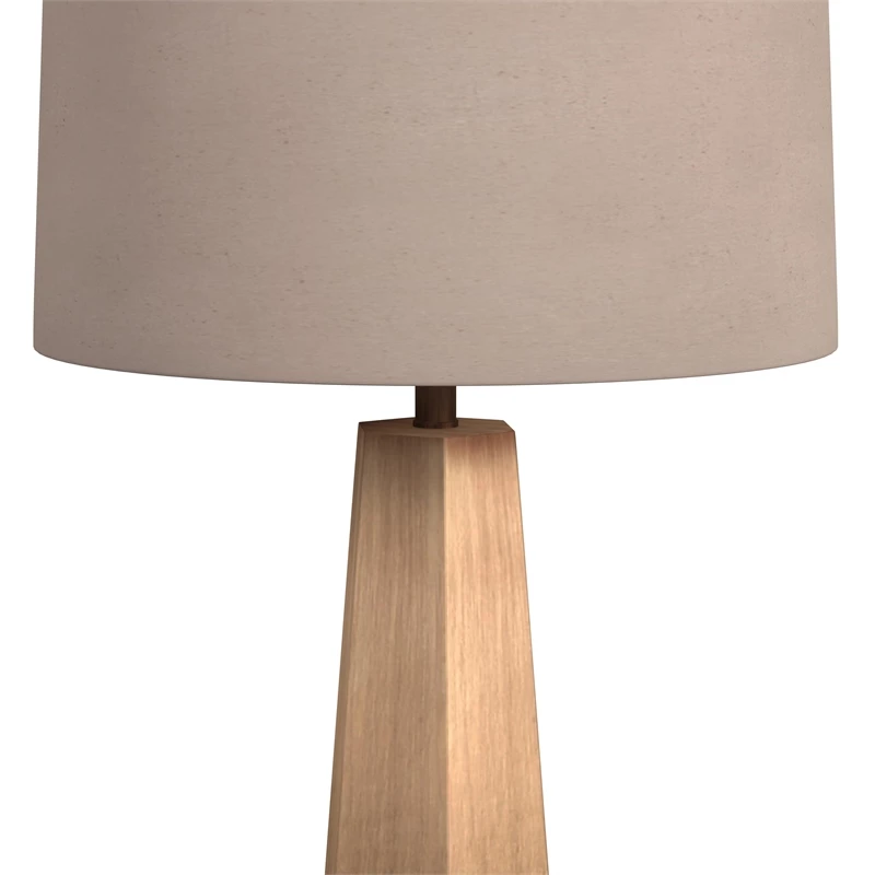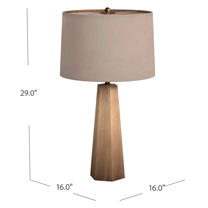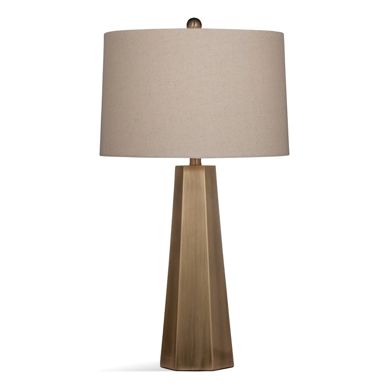 The Marsham Table Lamp features a metal hexagonal shaped body and finished in brushed gold. It is paired with a beige linen drum shade.