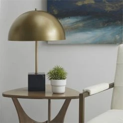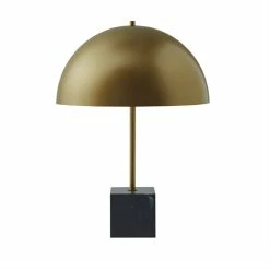 The piper table lamp by ink+ivy offers a sophisticated mid-century update to your side tables or desk tops. Flaunting a gold dome shade and stand, this table lamp features a cubed resin base imitating black marble look to create an elegant and refined contrast. A black power cord coordinates with the bold design to give your living room a refined touch. Uses 1, 60 watt type a light bulb (not included).
