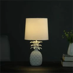 Add cool coastal, tropical style to a room with this pineapple table lamp. This sculpted, transitional pineapple table lamp is designed as a stylized pineapple with detailed leaves. Pineapples are the universal symbol of hospitality, this poly-resin pineapple in white adds whimsical character to any space. Bring an eye-catching, stylish piece into your home with this island-inspired table lamp, the cottage white finish really makes the lamp stand out, and it comes with a hardback fabric uno-fitter shade in white. Illuminate your living room space with this transitional pineapple table lamp. This accent lamp comes in a white finish that is visually striking and enhances most types of decors. Meticulously crafted for artistic quality, this contemporary table lamp shows off wonderful detail and dimensionality.