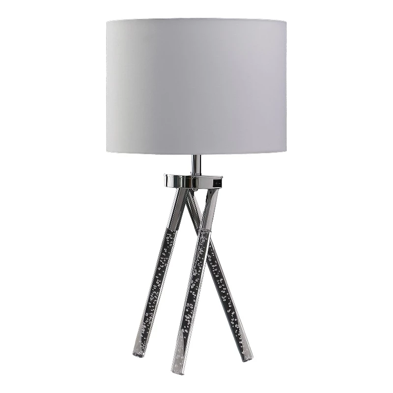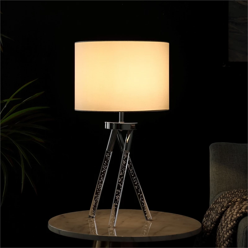 This Birgit Mid-Century modern table lamp offers a charming geometric LED tripod legs silhouette. Mid-Century Modern design elements add a relaxed look to this casual transitional table lamp. Fashioned of acrylic and silver chrome metal, the Birgit table lamp offers modern vibes with personality. LED leg lights has it’s own On/Off Switch to operate. A tubular shape pieced body features bubble acrylic LED legs construction, as silver chrome finish metal accents include a ring structure in between the legs and top bulb socket. Topped with a natural uno-fitter cotton/linen drum shade, this pleasing lamp is perfect for an urban or a Mid-Century retreat. The spiral bedside lamp can be an ideal choice for a bedroom, living room, office, corridor, bedside table, or bedside night light.