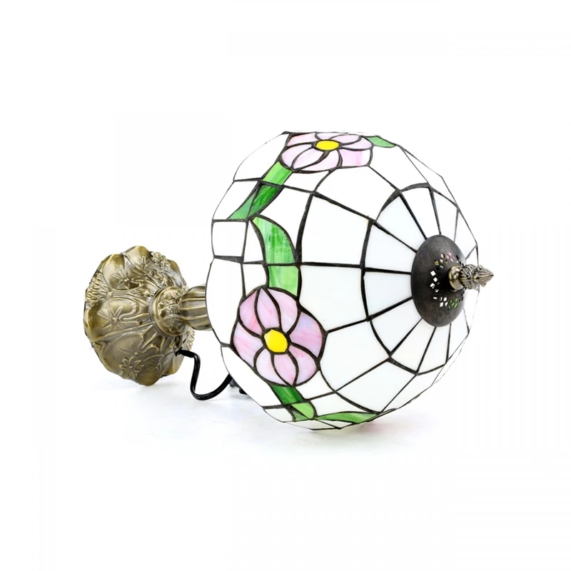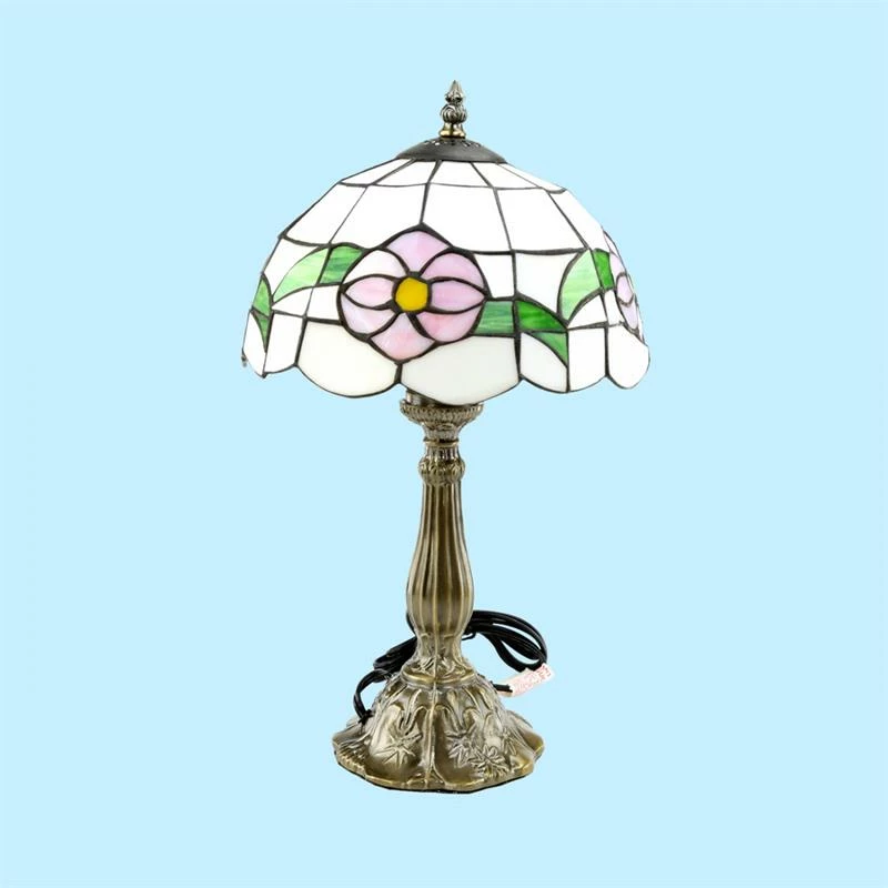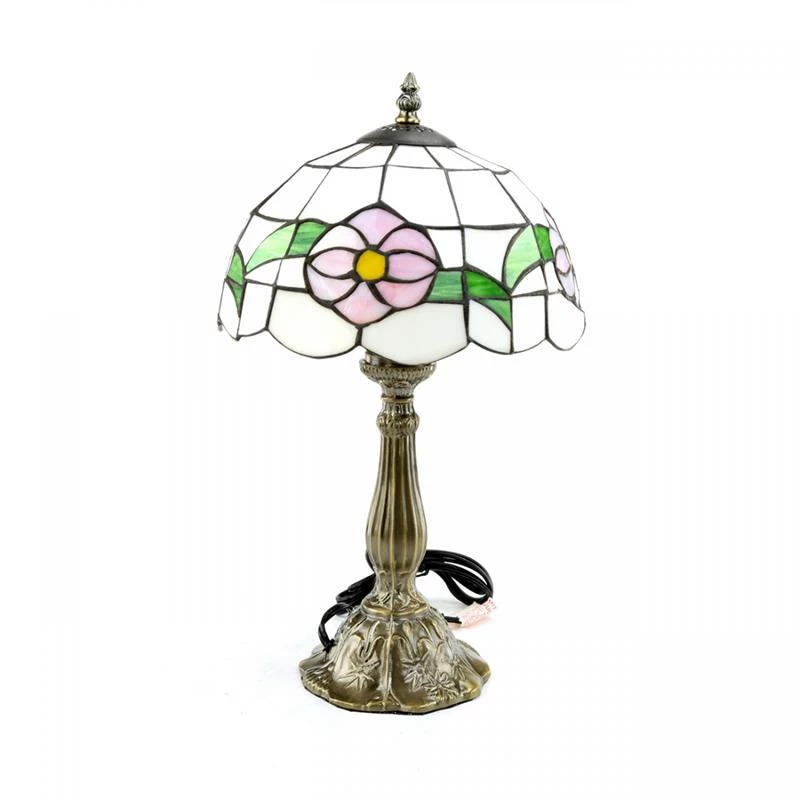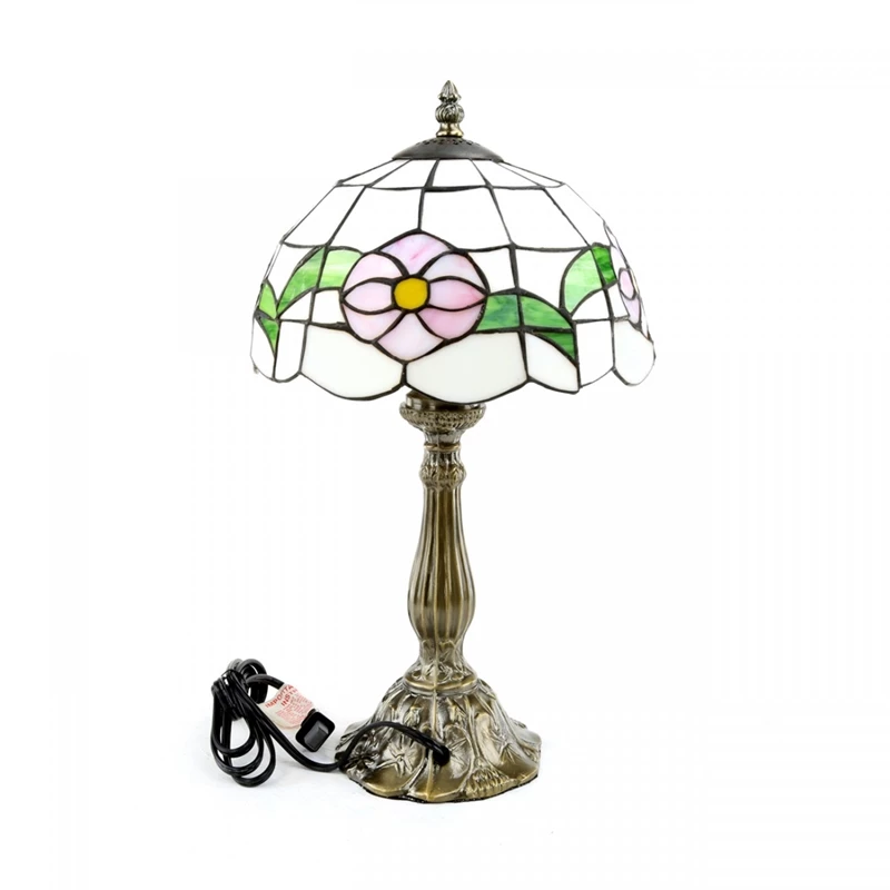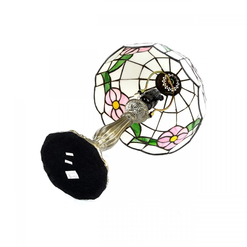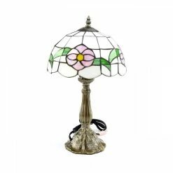 Antique Brass Style Stained Glass Table Desk Lamp. This antique brass floral base is apply named Le Bouquet and measures 18 3/4 inches high. Solid Brass base with felted bottom and an antique finish. On/Off switch, takes a 60 watt, B style bulb, not included. Measures 18 3/4 in. H x 10 in. dia. shade x 5 3/4 in. base.