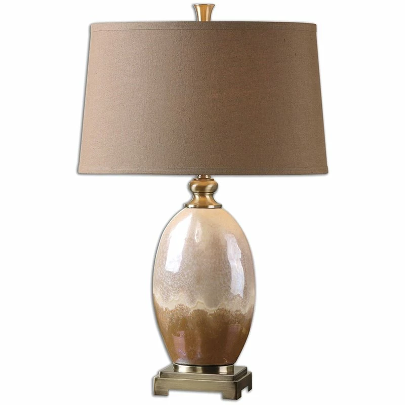 Ceramic base finished in an iridescent ivory and rust brown glaze accented with plated brushed antiqued gold details. The tapered oval hardback shade is a rust brown linen fabric with natural slubbing. Due to the nature of fired glazes on ceramic lamps, finishes will vary slightly.