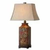 With the advanced product engineering and packaging reinforcement, Uttermost maintains some of the lowest damage rates in the industry. Each product is designed, manufactured and packaged with shipping in mind. Uttermost’s lamps combine premium quality materials with unique high-style design.Textured ceramic base finished in a distressed dark blue glaze with a dark bronze drip. The square bell shade is an oatmeal linen fabric with natural slubbing.