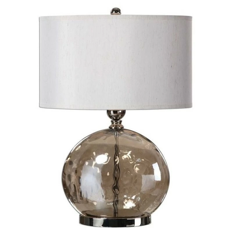 Iridescent water glass accented with plated polished nickel details. The oval hardback drum shade is a light beige linen fabric with natural slubbing.